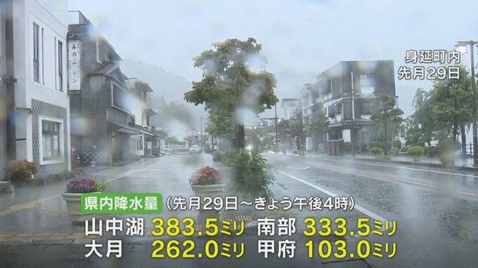 台風10号の接近に伴い、県内は8月29日から大雨となり、降り始めから9月2日午後4時までの降水量は、山中湖で383.5mm、南部で333.5mm、甲府で103.0mmなどとなりました。