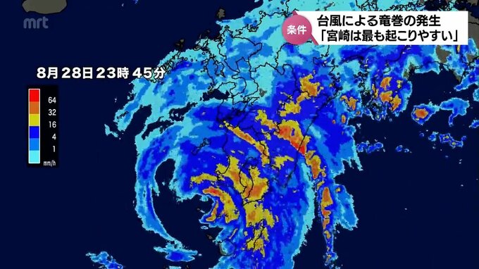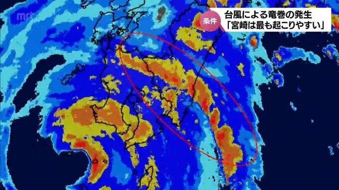 小林教授によると、竜巻は台風の中心から腕のように延びた「アウターレインバンド」と呼ばれる積乱雲の列で発生しやすく、その台風の腕は、200から600キロ程度に及ぶということです。