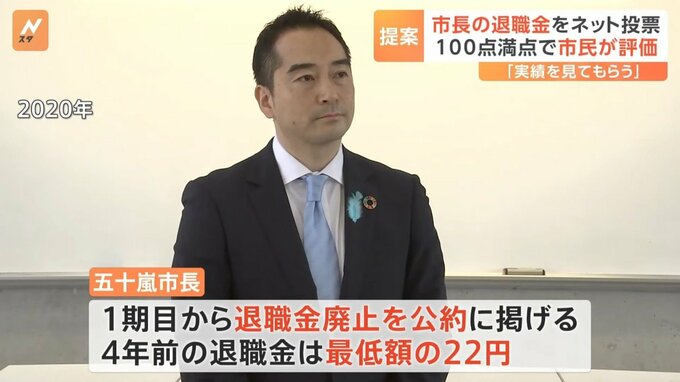 市民にネット投票してもらい、100点満点で評価。その平均点を退職金に反映させるというのです。これが導入されれば全国初の試みだと言います。