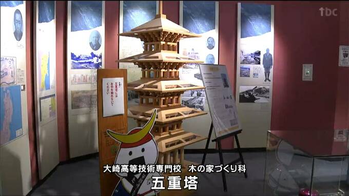 大崎高等技術専門校の「木の家づくり科」の学生が制作した五重塔は、釘などは一切使わず、木材を組み合わせて、高さおよそ2.5メートルの塔を完成させました。