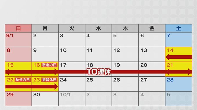 14日(土)~16日(月)の「敬老の日」までと、22日(日)の「秋分の日」をはさんで21日(土)~23日(月)までです。