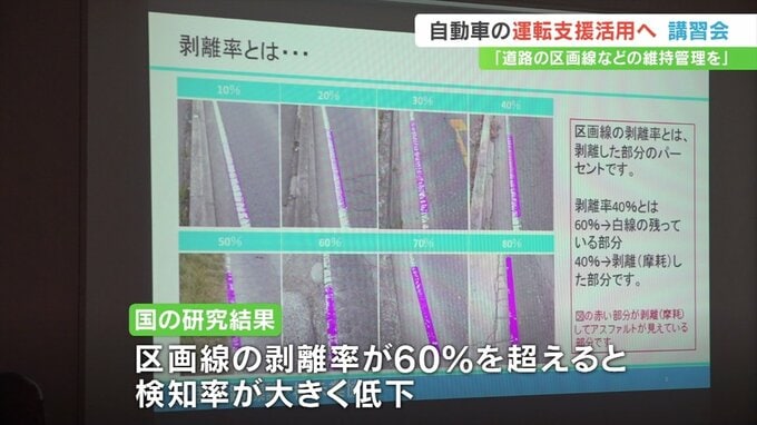 講習会では車載カメラで区画線などの路面を検知している自動車の車線逸脱防止システムについて区画線が摩耗などによってはがれた割合=剥離率が60%を超えると検知率が大きく低下するという国の研究結果が報告されました。