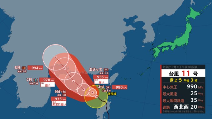 「台風11号」は、北緯18度30分、東経118度35分を中心に『南シナ海』で西北西方向に時速20kmの速さで進んでいるとみられています。中心の気圧は990ヘクトパスカルで中心付近の最大風速は25メートル、最大瞬間風速は35メートルとなっています。台風の全域280kmが秒速15m以上の強風域となっています。