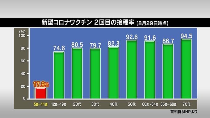 国の統計によると、8月29日時点で2回の接種を終えた割合を見てみると、5歳から11歳までの子供が17.9%なのに対し、そのほかの年代はいずれも70%を超えています。