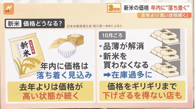 日本米穀商連合会の相川英一専務によると、▼年内に価格は落ち着く見込みだといいます。ただ、去年より価格が高い状態が今後も続いていくだろうということです。