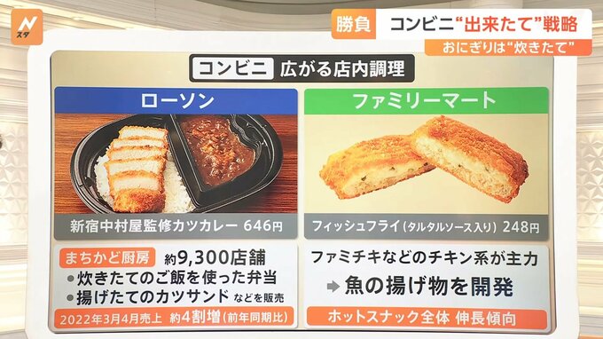 ローソンは「新宿中村屋監修 カツカレー」(646円)を販売しています。まちかど厨房というものが約9300店舗にあり、炊きたてのご飯を使った弁当、揚げたてのカツサンドなどを販売しています。