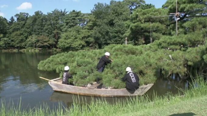 はんてんをまとった庭師6人が、樹齢200年近い園内随一の枝ぶりを誇る「唐崎松」で、木の形が崩れないように、枝の先端にある葉を1つずつ丁寧にむしり取っていきました。