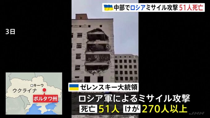ウクライナ中部で3日、ロシア軍によるミサイル攻撃があり、51人が死亡しました。一方、国際刑事裁判所の加盟国であるモンゴルを訪問していたプーチン大統領は逮捕されず、帰国しています。ウクライナのゼレンスキ…