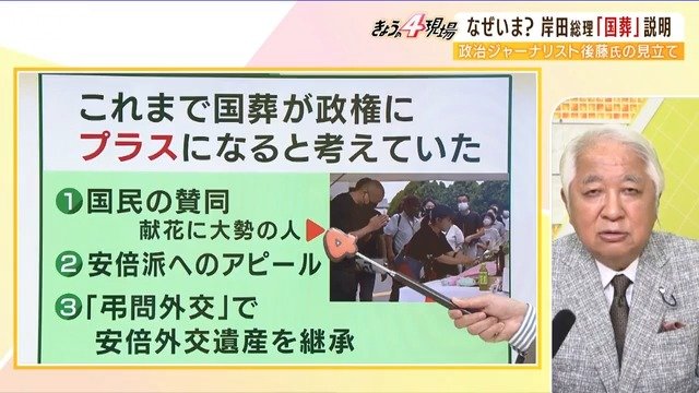 マイナス200%しても(国葬の)撤回はしないと思いますね。これだけ政治問題化をして、岸田総理は重ねてやると言ったからには、撤回はイコール、総理退陣まで行き着いてもおかしくない、それだけの政治問題化しちゃったわけです。岸田さんの最初の読み違いが今日に至っているんだと思います。安倍さんが亡くなられて、14日に国葬表明、22日には閣議決定していますがそのときは、旧統一教会問題はここまで大きくなってなかったわけですね。つまり旧統一教会問題の拡大に比例するように、国葬反対が増えてきている。 そして元々、安倍総理の政治手法は、白黒、敵味方を峻別して、その摩擦熱で政策を推進していこうというもの。多くの反対派も存在したわけですね。それが旧統一教会問題に従って、ラインが徐々に反対の方に移っているというのが今の状況だと思います。