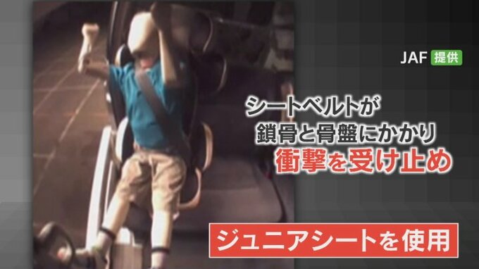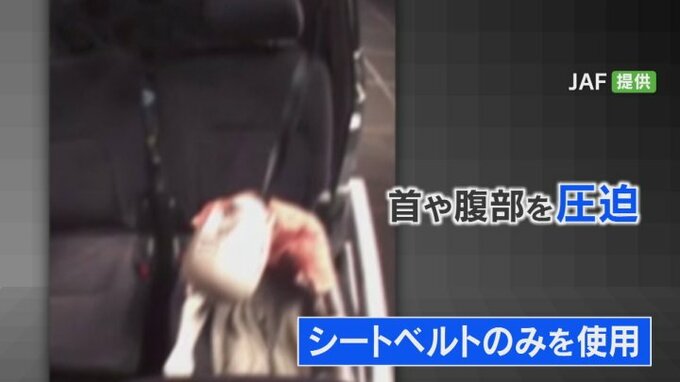 ジュニアシートを使用した場合はベルトが衝撃を受け止めてる一方、シートベルトのみを使用すると首やお腹を強く圧迫しています。