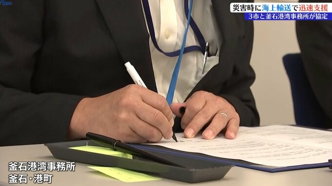災害時の陸路の分断などを想定して、沿岸3つの市と港湾事務所が海上輸送で災害対応支援を行う協定を結びました。