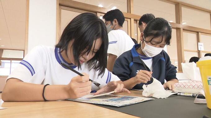 校歌の歌詞が書かれたパネル製作に挑戦した生徒たちは、10センチほどのパネルに歌詞を1文字ずつ、黒く塗っていきます。