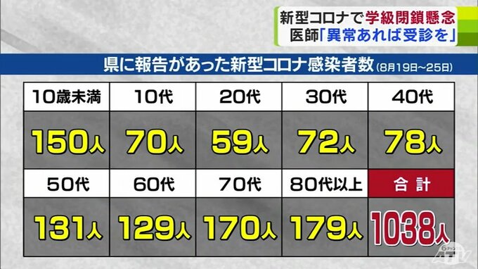 県のまとめによりますと、新型コロナの感染者数は8週連続で増加しています。8月19日~25日の1週間で確認されたのは1038人で、年齢別では10歳未満と50代以上が多くなっています。