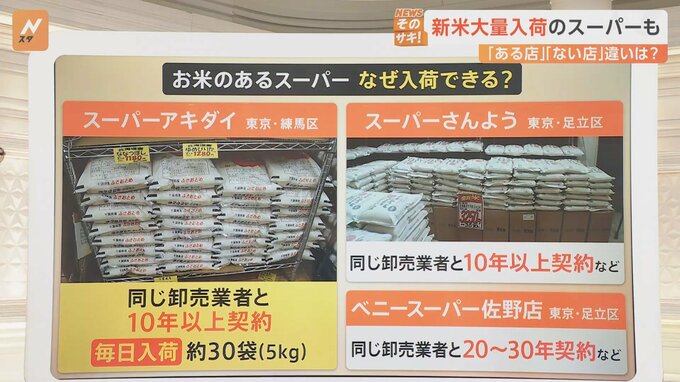 お米のあるスーパーに聞きました。▼東京・練馬区「スーパーアキダイ」は同じ卸売り業者と10年以上、長期にわたり契約をしているため、毎日 約30袋(5㎏)入荷するといいます。▼東京・足立区「スーパーさんよう」は同じ卸売業者と10年以上契約など ▼東京・足立区「ベニ―スーパー佐野店」は同じ卸売業者と20~30年契約などをしているそうです。