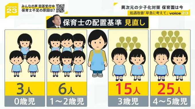 国は76年ぶりに保育士の配置基準を見直しました。2024年度から、保育士1人が見る子どもの数を4~5歳児は30人→25人。さらに3歳児は20人→15人にしました。