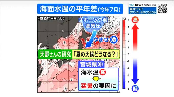 また、宮城県沖では、去年、今年と海面水温が平年より異常に高い状態が続いていて、これも猛暑の要因のひとつと考えられています。天野さんは、現在、このように海面水温が高い状態で冷たい風を吹かせるオホーツク海高気圧が発生したら夏の天候はどうなるのか、という研究に取り組んでいるそうです。
