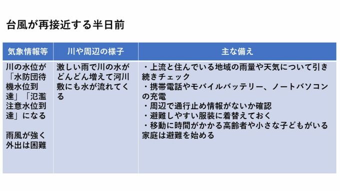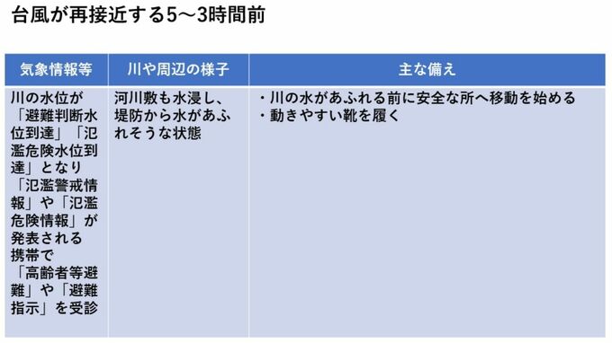台風の再接近が予想される5~3時間前には、さらに川の水位が上昇し「高齢者等避難」や「避難指示」などが発表される頃です。
