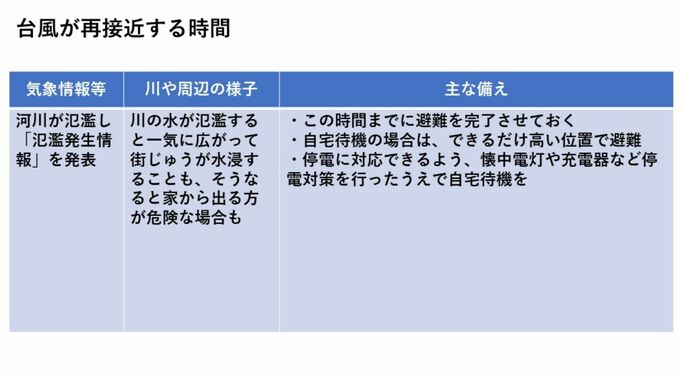 台風が再接近すると、この時間から避難のための移動はかえって危険を伴います。自宅の安全な場所で避難しながら、災害情報などをチェックしましょう。