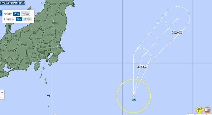 台風はこの後、熱帯低気圧に変わり、24時間後の6日午後3時には日本の東の半径80キロの円内に達する見込みです。中心の気圧は1006ヘクトパスカルが予想されます。台風や熱帯低気圧の中心が予報円に入る確率は70%です。