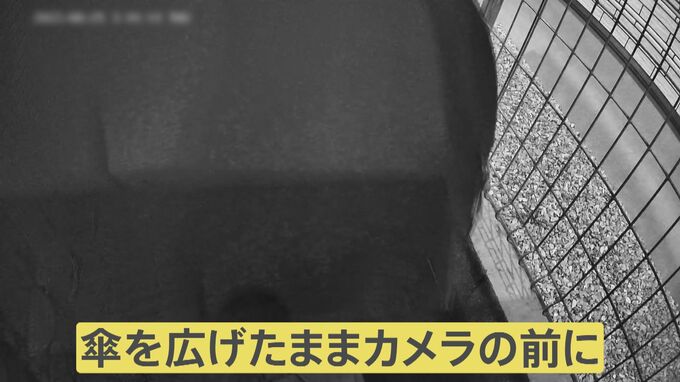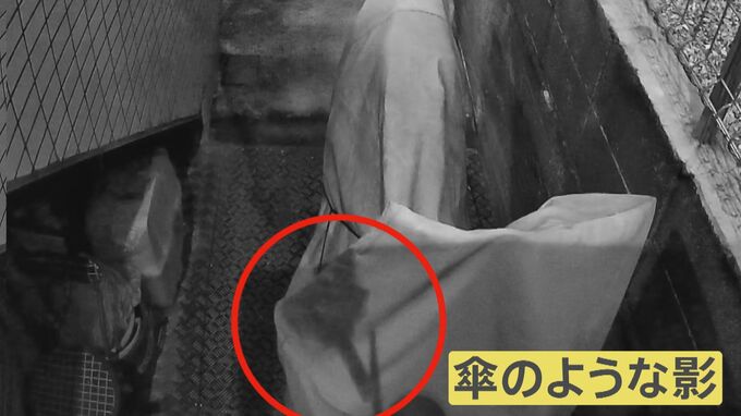 入口付近を捉えていたカメラが突然下を向きます。なぜ傾いたのか?その瞬間の映像には傘のような影が・・・
