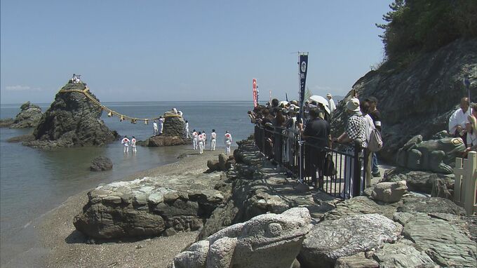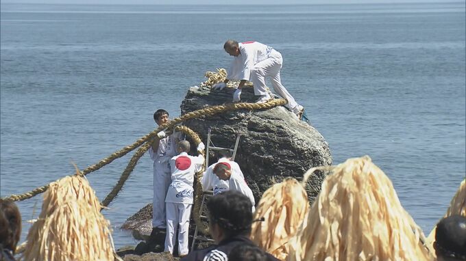 三重県伊勢市の夫婦岩(めおといわ)で、大しめ縄の張り替え神事が行われました。