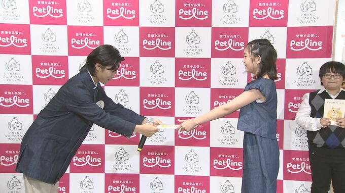 アンバサダーに就任した寺田さんは、“小さい頃からシニア期について学んでいくのは大事なことだと思います。僕の小さい頃は、動物の保護ばかり考えていたけど、保護した後のことも大事。こうした絵本が小さい子たちの手に渡ると考えるとうれしいです″と挨拶し、「愛犬・愛猫のシニアのそなえ」をテーマに製作されたオリジナル絵本を来場した小学生に贈呈。フォトセッションでは、手渡した小学生に本の持ち方やマイクのスイッチを教えるなど、お兄さん的な気遣いを見せていました。