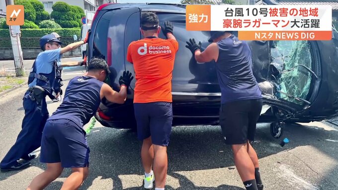 台風10号で被害に遭った宮崎市に、合宿中のラグビーチーム「浦安D-Rocks」がボランティア活動を行いました。さらに、交通事故で横転した車を道具を使わず戻すなど、大活躍でした。