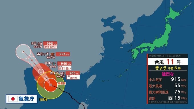 台風11号は南シナ海で猛烈な勢力となっています。中心気圧は915hPa、最大風速は55メートル、最大瞬間風速は75メートルとなっています。台風11号はこのまま大陸方面へと向かう見込みです。