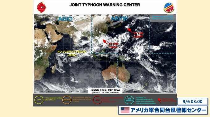 アメリカ・ハワイにあるアメリカ軍の合同台風警報センター(JTWC)の情報です。ここでは監視すべき対象となりうる熱帯低気圧についての情報や台風となった場合の警戒情報などが表示されます。