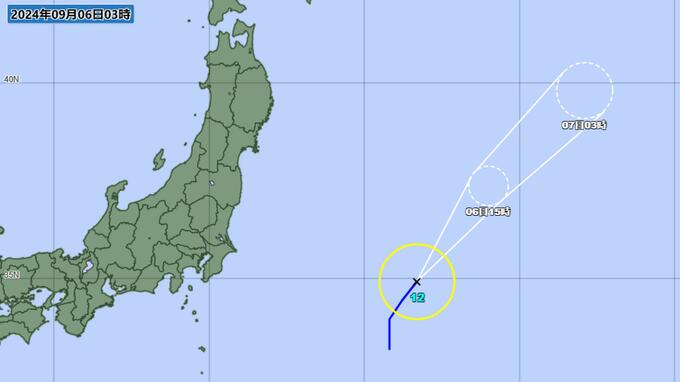 5日15時、日本の東海上で熱帯低気圧が台風12号になりました。台風は1時間におよそ15キロの速さで北へ進んでいます。中心の気圧は1002ヘクトパスカル、中心付近の最大風速は18メートル、最大瞬間風速は25メートルで中心から半径110キロ以内では風速15メートル以上の強い風が吹いています。台風は北東方向へ進み日本からは離れていく見込みで、7日には熱帯低気圧に変わる予報です。(5日16時5分 気象庁発表)
