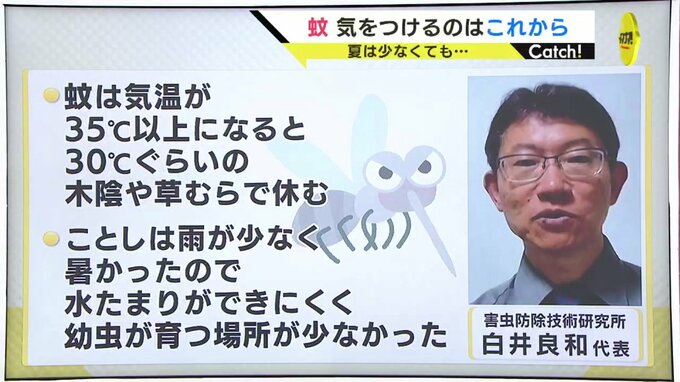 「やはり雨が少なくて、降水量が少ないと水たまりができにくい。少し水たまりができても、高温ですと蒸発しやすくなって水たまりがなくなってしまう。そういった状況においては、幼虫は水たまりで育ちますから、幼虫が育つ場所が少なかったので、幼虫が少なくなり、成虫も少なくなったと考えられる」