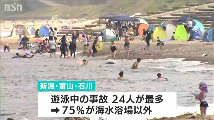 9管が管轄する新潟・富山・石川の全体でみると、最も多かったのは遊泳中の事故の24人で、事故の75%が海水浴場ではない場所で発生していたということです。