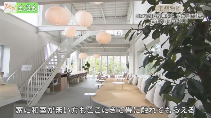 --久保木史朗さん(久保木畳店 15代目)「こちらが畳のカフェです。家に和室が無い方も、ここに来て畳に触れてもらえるというところです。」