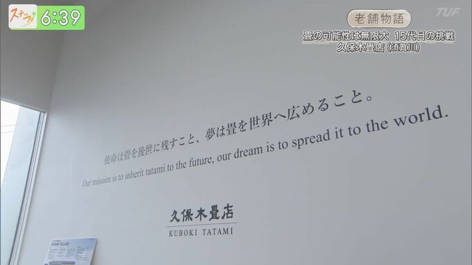 お店の壁にはこんな言葉が。“使命は畳を後世に残すこと、夢は畳を世界へ広めること。”畳の可能性は無限大です。
