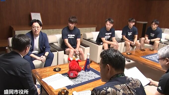 盛岡市役所を訪れたのは、岩手ビッグブルズの水野哲志社長と鈴木裕紀ヘッドコーチ、さらに後藤翔平キャプテンら選手3人です。