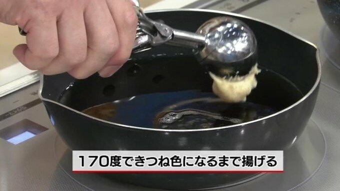 7.揚げ油を170度に熱し6の生地をスプーンですくって入れ、きつね色になるまで揚げる。