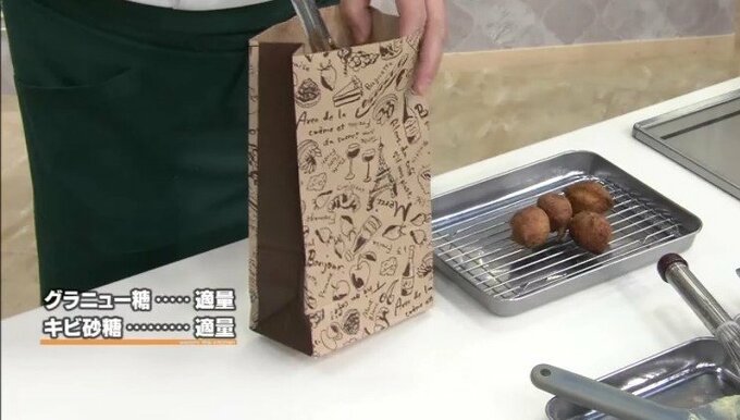 8.紙袋に揚げたドーナツとキビ砂糖・グラニュー糖を入れて振り、ドーナツ全体に砂糖をまぶして完成!