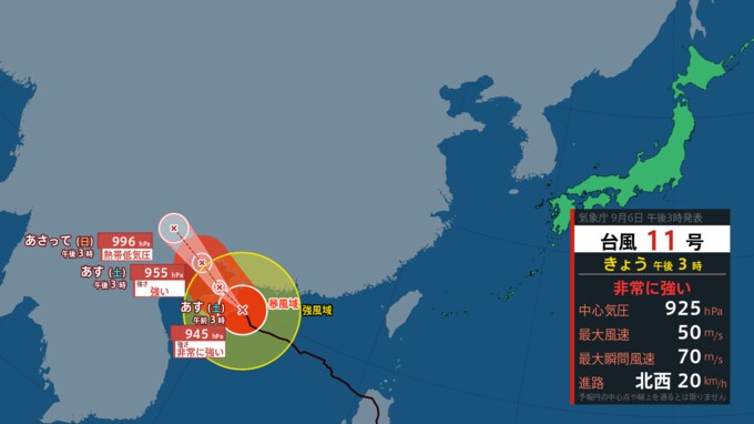 「台風11号」は「非常に強い勢力」で、北緯19度50分、東経111度20分を中心に『南シナ海』で北西方向に時速20kmの速さで進んでいるとみられています。中心の気圧は925ヘクトパスカルで中心付近の最大風速は50メートル、最大瞬間風速は70メートルとなっています。台風の全域390kmが秒速15m以上の強風域となっていて、全域165kmが秒速25m以上の暴風域となっています。
