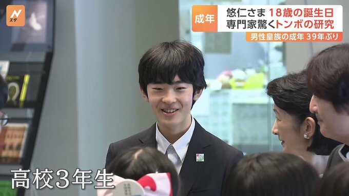 秋篠宮家の長男・悠仁さまが18歳の誕生日を迎えられました。男性の皇族が成年となるのは39年ぶりです。今、悠仁さまはトンボの研究で専門家も驚く研究成果をあげられています。先ほど、午後5時すぎ、皇居を訪問さ…