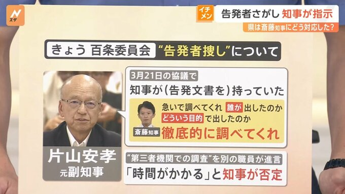 6日の百条委員会で、“告発者捜し”について片山安孝元副知事は「3月21日の協議で、知事が(告発文書を)持っていた。知事からは『急いで調べてくれ、誰が出したのか、どういう目的で出したのか、徹底的に調べてくれ』と言われた」と話しています。