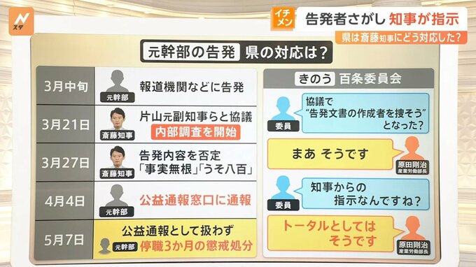 まず5日の百条委員会で、『協議で“告発文書の作成者を捜そう”となったのか』という質問に対し、斎藤知事の側近、原田剛治産業労働部長は「まあそうです」と答え、『知事からの指示なんですね?』という質問には「トータルとしてはそうです」と認めました。