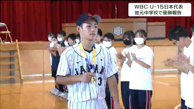 15歳以下の野球の世界大会で優勝に貢献した宮城県川崎町出身の中学生が、在校生の前で世界一を報告しました。