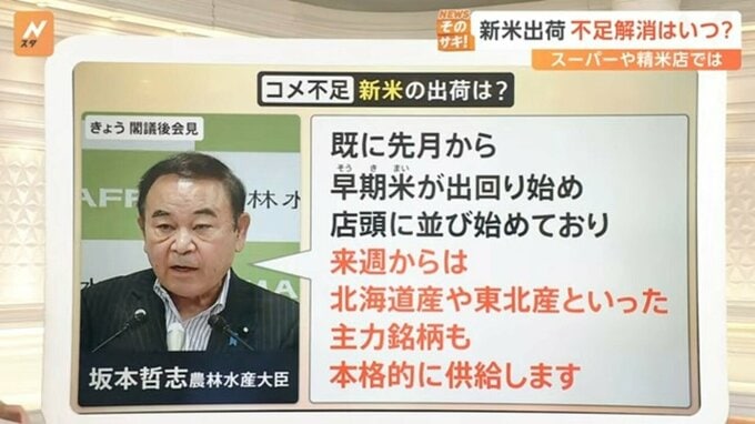 新米の出荷について坂本哲志農林水産大臣は、6日の閣議後の会見で「既に先月から早期米が出回り始め店頭に並び始めており、来週からは北海道産や東北産といった主力銘柄も本格的に供給します」としています。