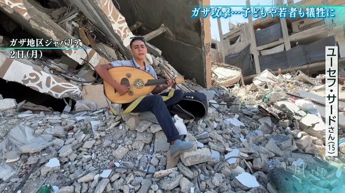 9月2日、ガザの瓦礫の中で、民族楽器を奏でる15歳の少年…