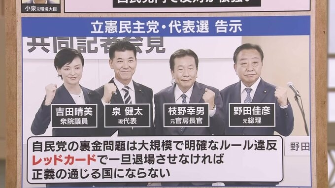 一方、立憲民主党の代表選が7日告示されました。枝野元官房長官、野田元総理に続き、泉現代表、さらに当選1回の吉田晴美衆院議員も名乗りを上げました。泉代表は「自民党の裏金問題は大規模で明確なルール違反。レッドカードで一旦退場させなければ、正義の通じる国にならない」と政権交代を訴えています。