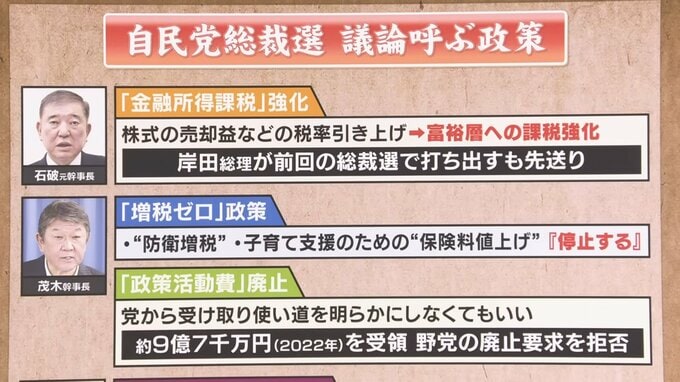まず、自民党総裁選。議論を呼ぶ政策がいくつか出てきました。石破元幹事長が表明したのが、「金融所得課税の強化」です。これは株の売却益などへの税率を引き上げ、富裕層への課税を強化しようというものですが、岸田総理が前回の総裁選で打ち出すも党内の反発などを受けて先送りした経緯があります。