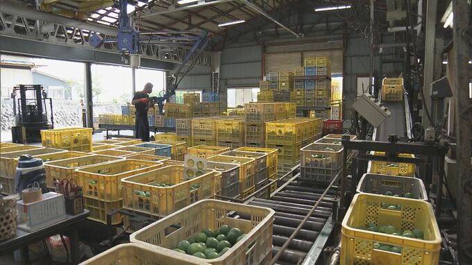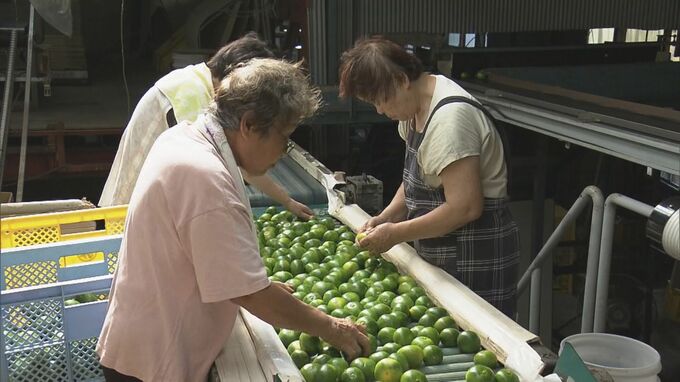 出荷作業が始まったのは、通常の温州ミカンよりも2か月ほど早く市場に出回る品種で、生産者の御浜柑橘では実に傷がないかなどを確かめながら箱詰めする作業に追われています。ことしは猛暑と雨が少なかった影響で実は、やや小ぶりですが糖度が高く美味しいミカンに育っているということです。
