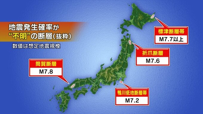 政府の地震本部がまとめた資料によると、内陸にあり、マグニチュード7以上の大地震を引き起こすおそれのある断層のみに絞っても48の断層が30年以内の地震発生確率が推定されていない。主なものは、青森県から岩手県にまたがる折爪断層、広島県の筒賀断層、 北海道東部の標津断層帯。首都圏でも千葉県南部の鴨川低地断層帯でマグニチュード7.2程度の地震が起こる可能性があるものの、発生確率は「不明」だ。