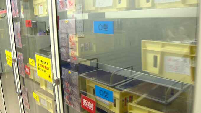 RKB吉松真希「こちらは輸血用の血液の保管室です。新型コロナの流行前までは、この大型冷蔵庫は血液の在庫で一杯だったということですが、現在は隙間が目立ちます」