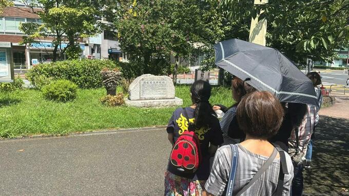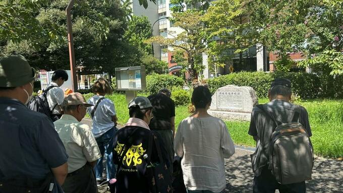 8月25日、石碑の前で「アイヌ民族の権利回復を求める会」主催のフィールドワークが行われ、メンバーの加藤登さんがこの場所について説明しました。
